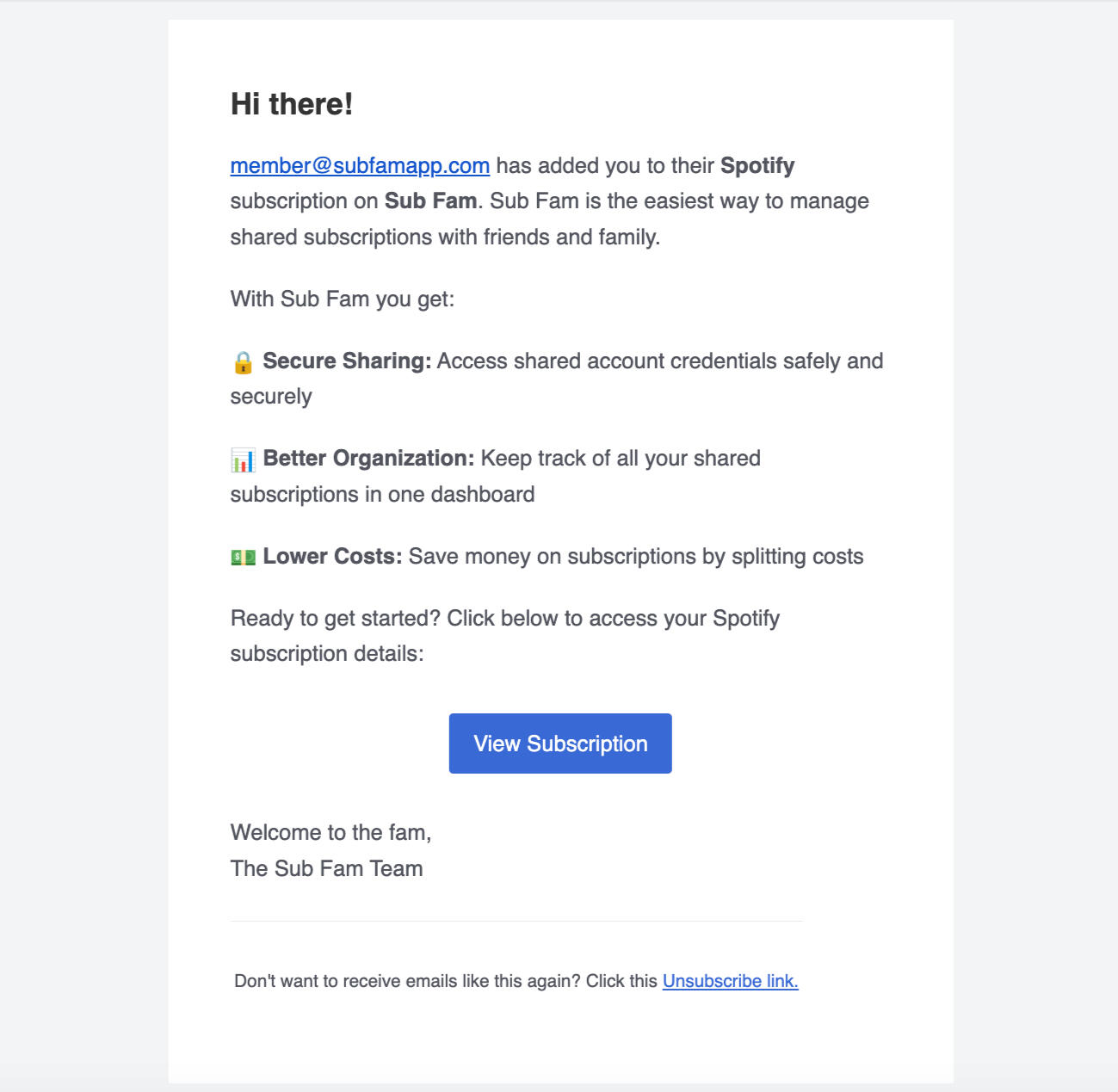 - members of the subscription are not registered Sub Fam users: they will still receive emails.