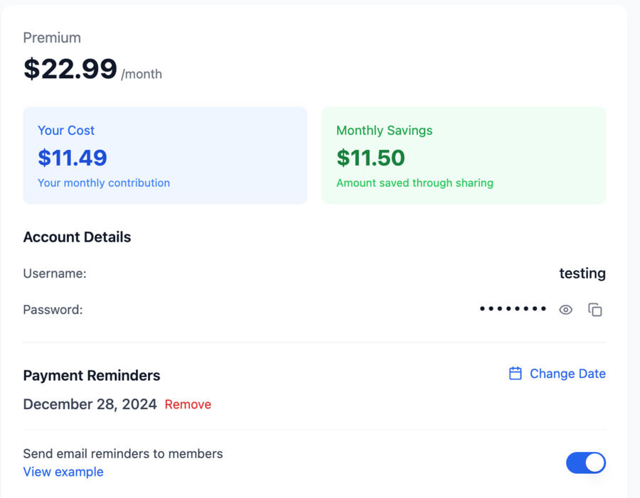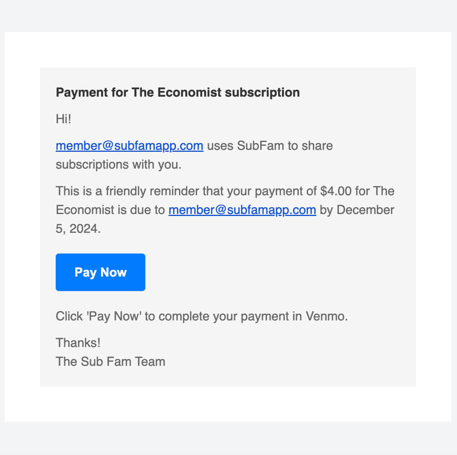 When adding members, subscription owners can provide Venmo, Zelle, and/or Cash App usernames. Sub Fam uses these usernames to generate payment links with payee, payer, and other transaction details.Subscription owners can choose to automate payment reminders using Sub Fam. Sub Fam will send emails to members with payment links to make it easy to complete payments.